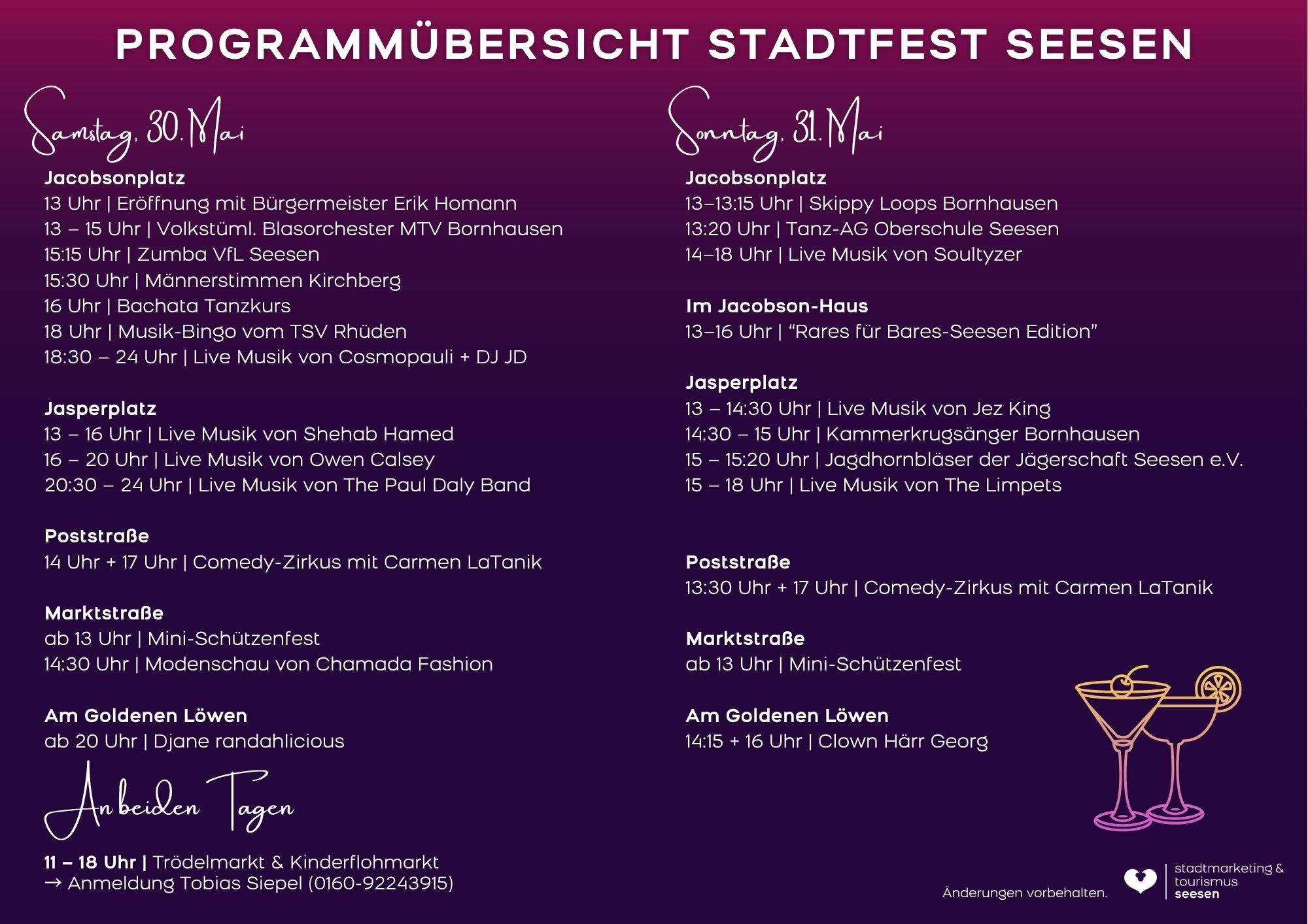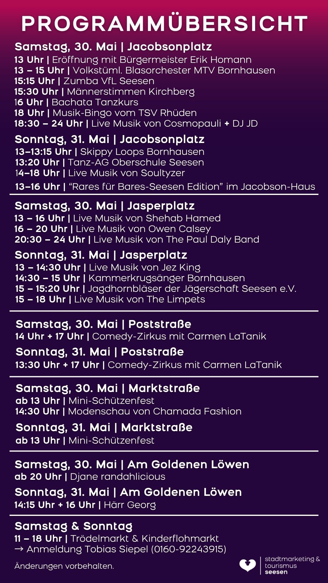 Ein besonderes Highlight ist die Seesener Nacht mit Live-Musik und DJs, die für beste Stimmung bis in die Nacht sorgen. Am Sonntag lädt zudem ein verkaufsoffener Sonntag zum entspannten Bummeln ein.